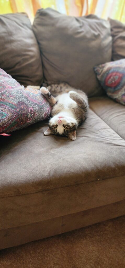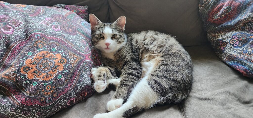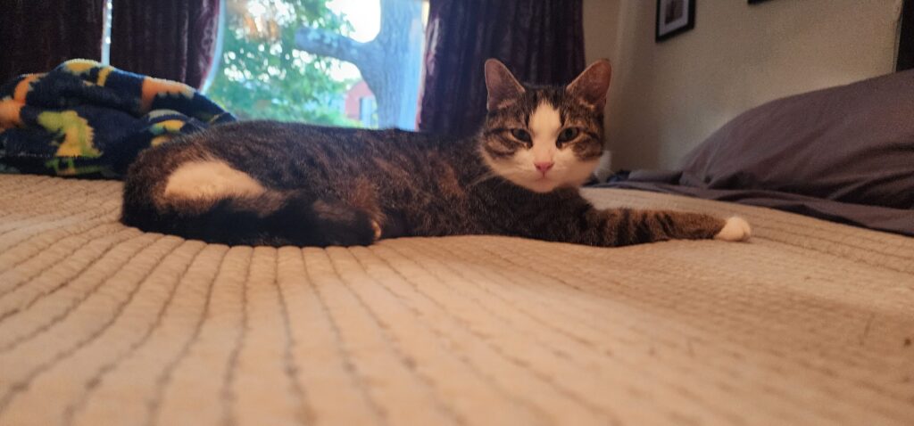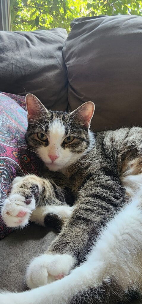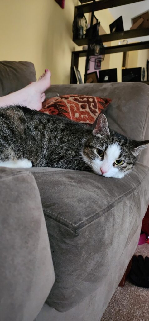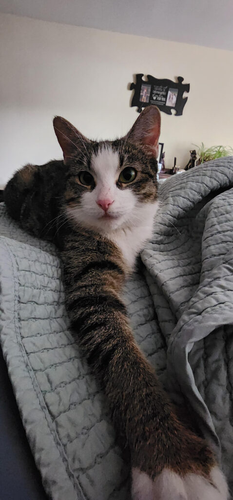 I love to play, especially if there’s a feather toy involved, and I’m a big fan of birdwatching from a sunny windowsill. I enjoy affection and love getting pets and snuggles from my foster mom.