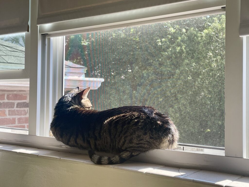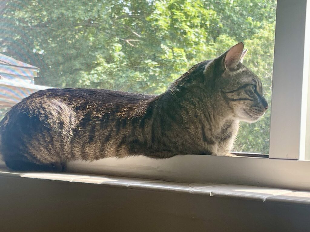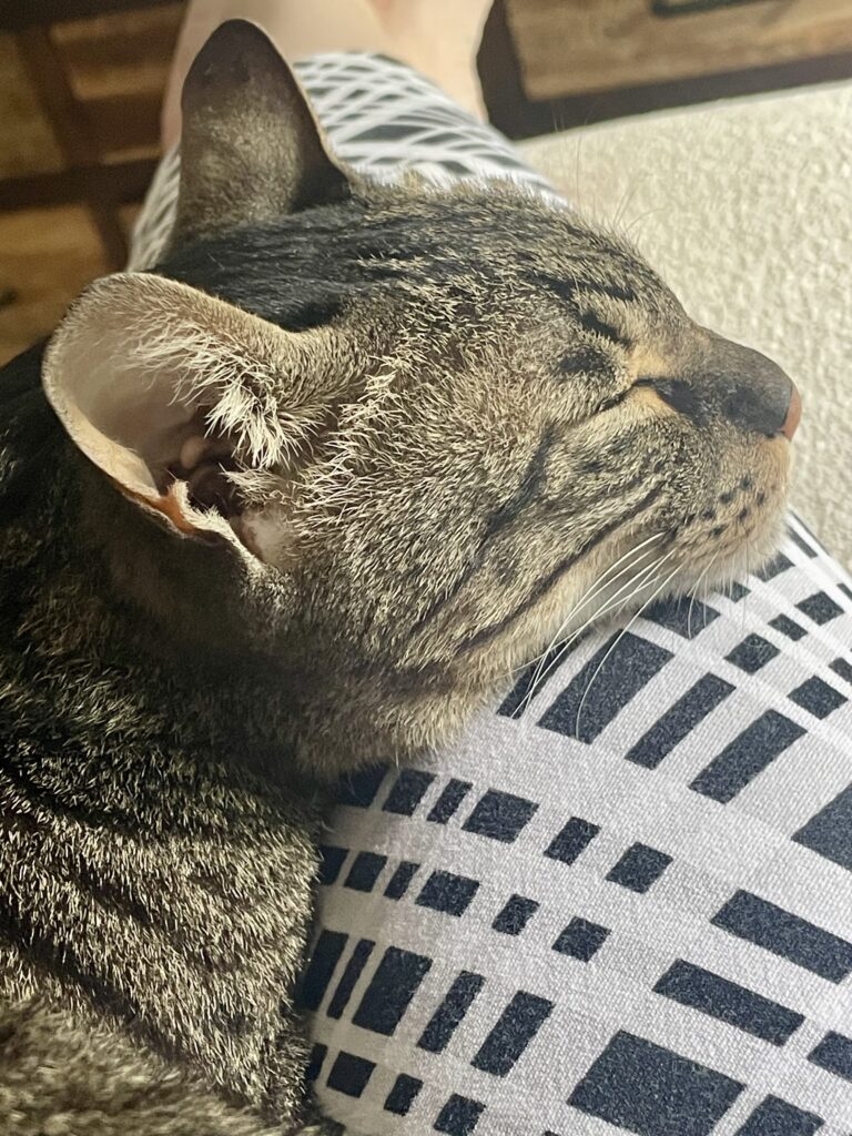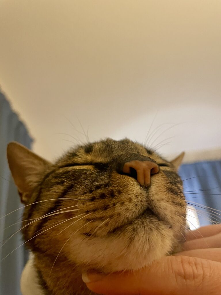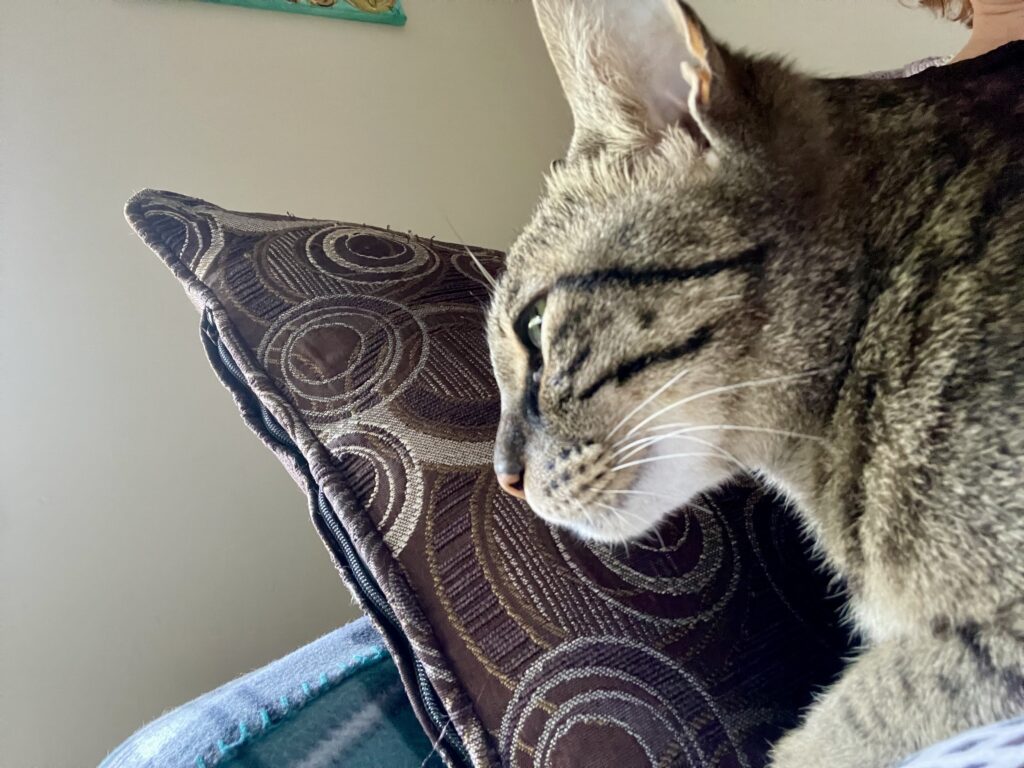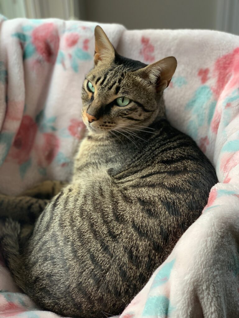 I’m Lynx, I’m an 8 year old boy, and I’m the toughest love bug you’ll ever meet. I like sitting in the window and making sure the neighborhood dogs and squirrels know who’s boss but in the home I love nothing more than lounging on a lap and getting pets. In all honesty I am a little anxious and I cope by doing laps and vocalizing. Sometimes I wear a weighted vest that calms my nerves a bit and makes me look SO cute. I’ve had kitty roommates before but my foster parents think I’d do better as an only. I’m trim, athletic and healthy with a good appetite and no litter box issues. I’ve also been told that I’m very very pretty 🙂