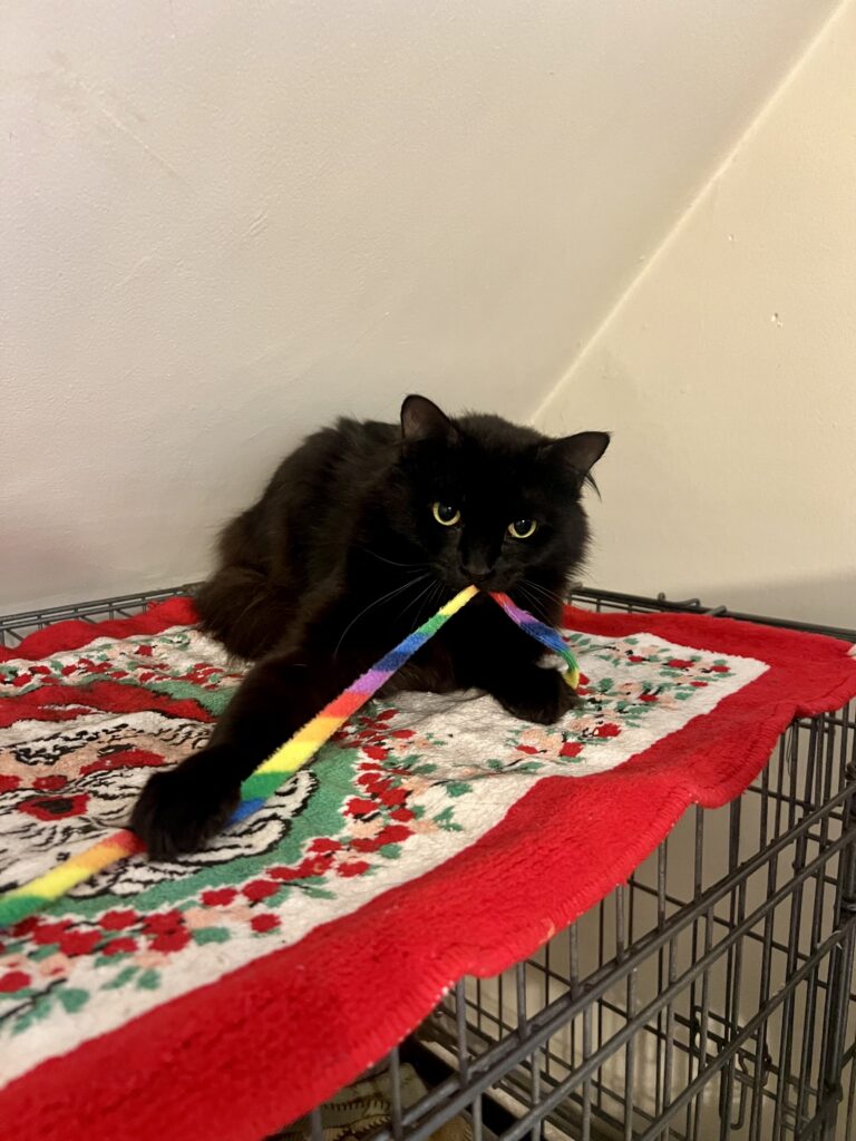 Hi I’m Perry! I am a sweet 2-year-old boy who had a rough start on the streets until Kitty Connection came along and gave me a second chance. I am a shy guy while I learn how to adapt to living in a safe home, but I am slowly learning to trust that I am now safe. I love hanging out in my perch next to my foster mom while she works. And I love meal time, but treat time is when I open up. Toys are new to me, but I have taken a special liking to my rainbow string to celebrate pride month! 🏳️🌈