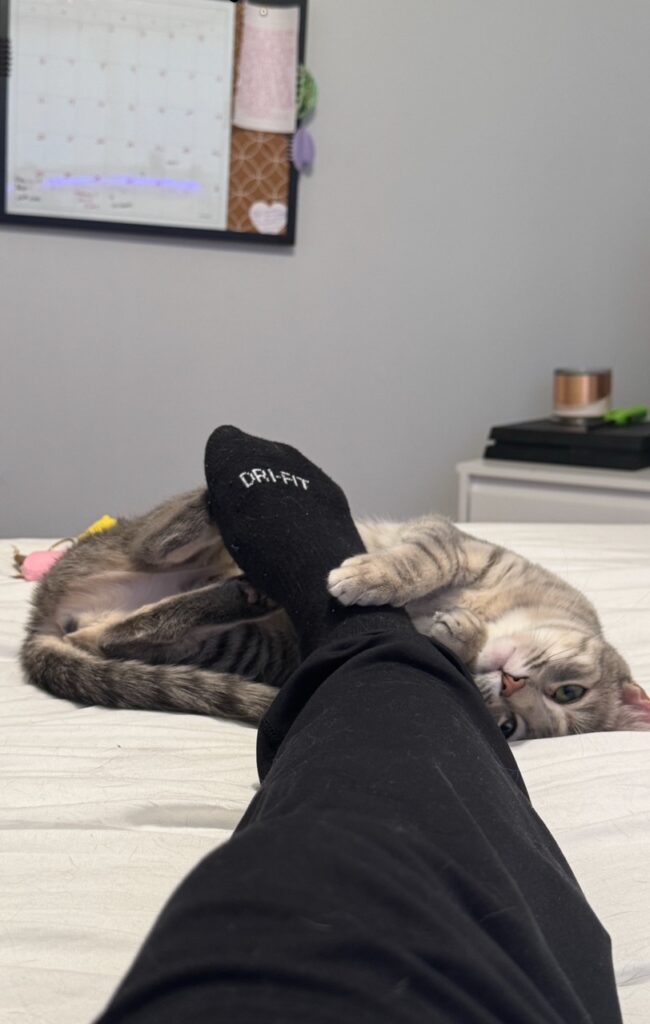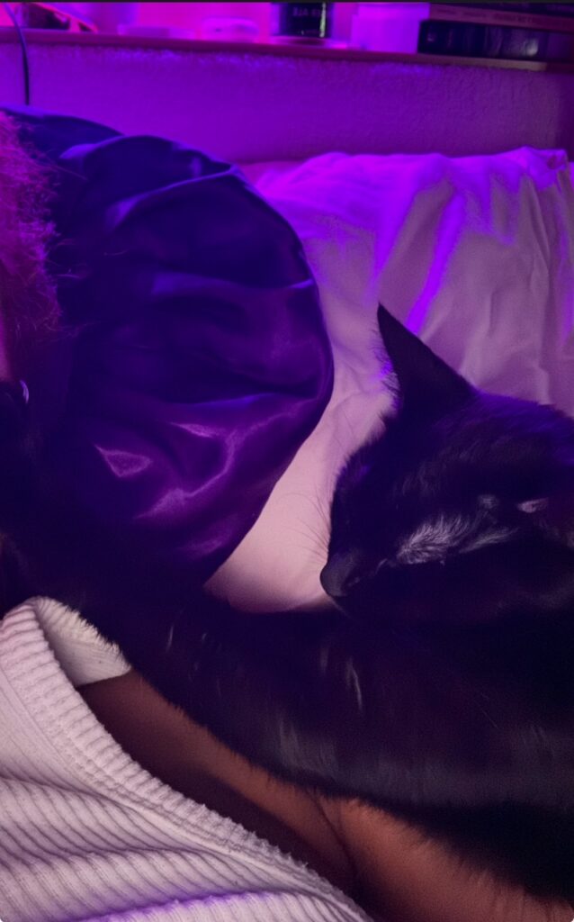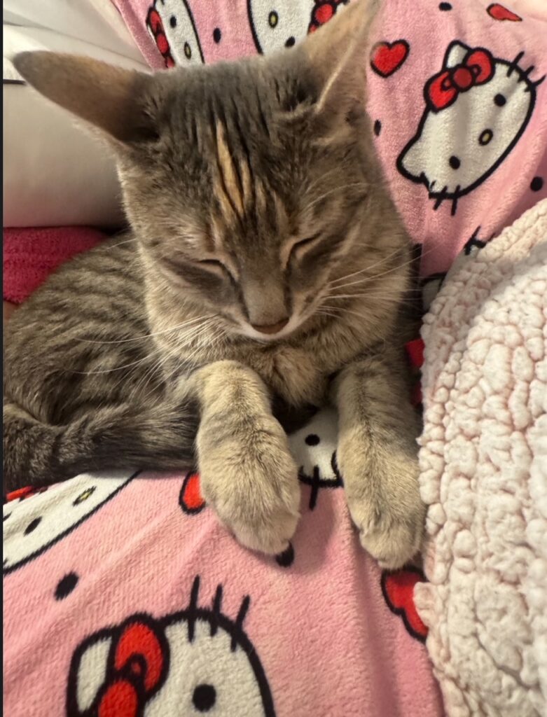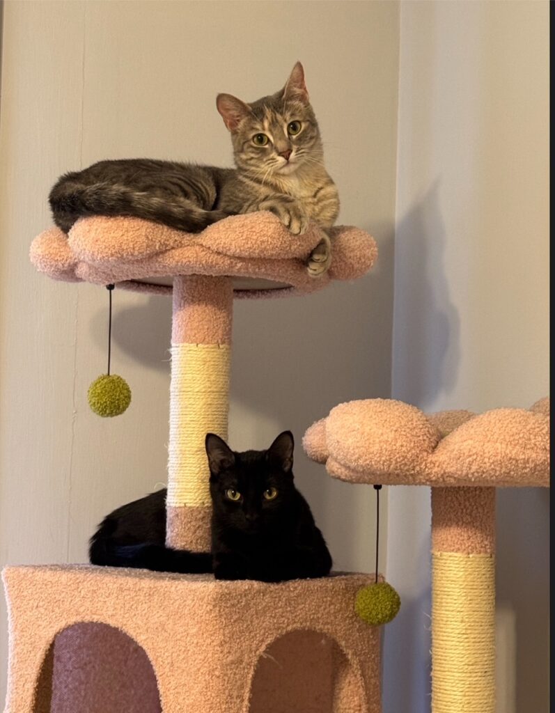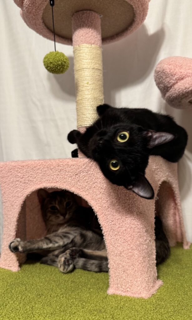 I, Nimmy, am the calmer of the two. I’m very chill and friendly, it does take me a few minutes to warm up to new people. Once I get to know you I LOVE laying on laps and often curl up on my human’s chest when they are laying down!