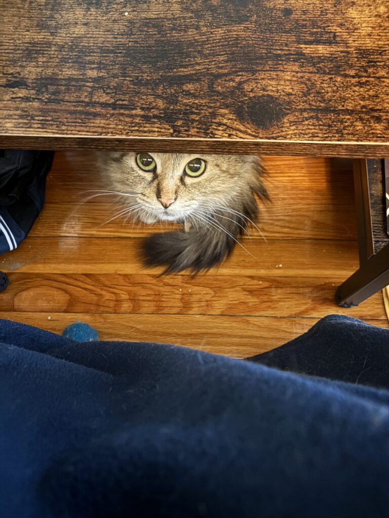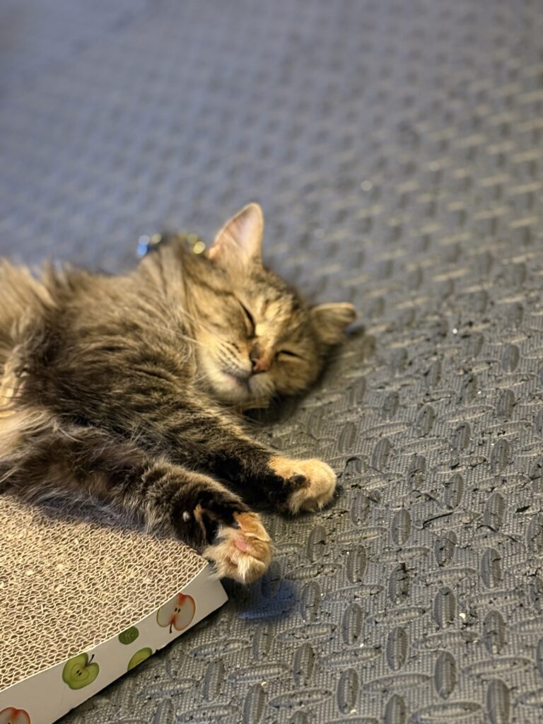 Hey there my name is Karen! I am a little over 1 year old, so some might say I’m still a baby myself. I was really scared in the beginning and was hiding most of the time, but now I run to the door to greet my foster mom as soon as she comes in, or if I hear her cats playing outside of my room! I absolutely love being around other cats, so I really hope my future home has some! Oh, and I’m a fabulous hunter, too! No kibble ever gets lost, even when my foster mom tosses them around the room on purpose just to throw me off!