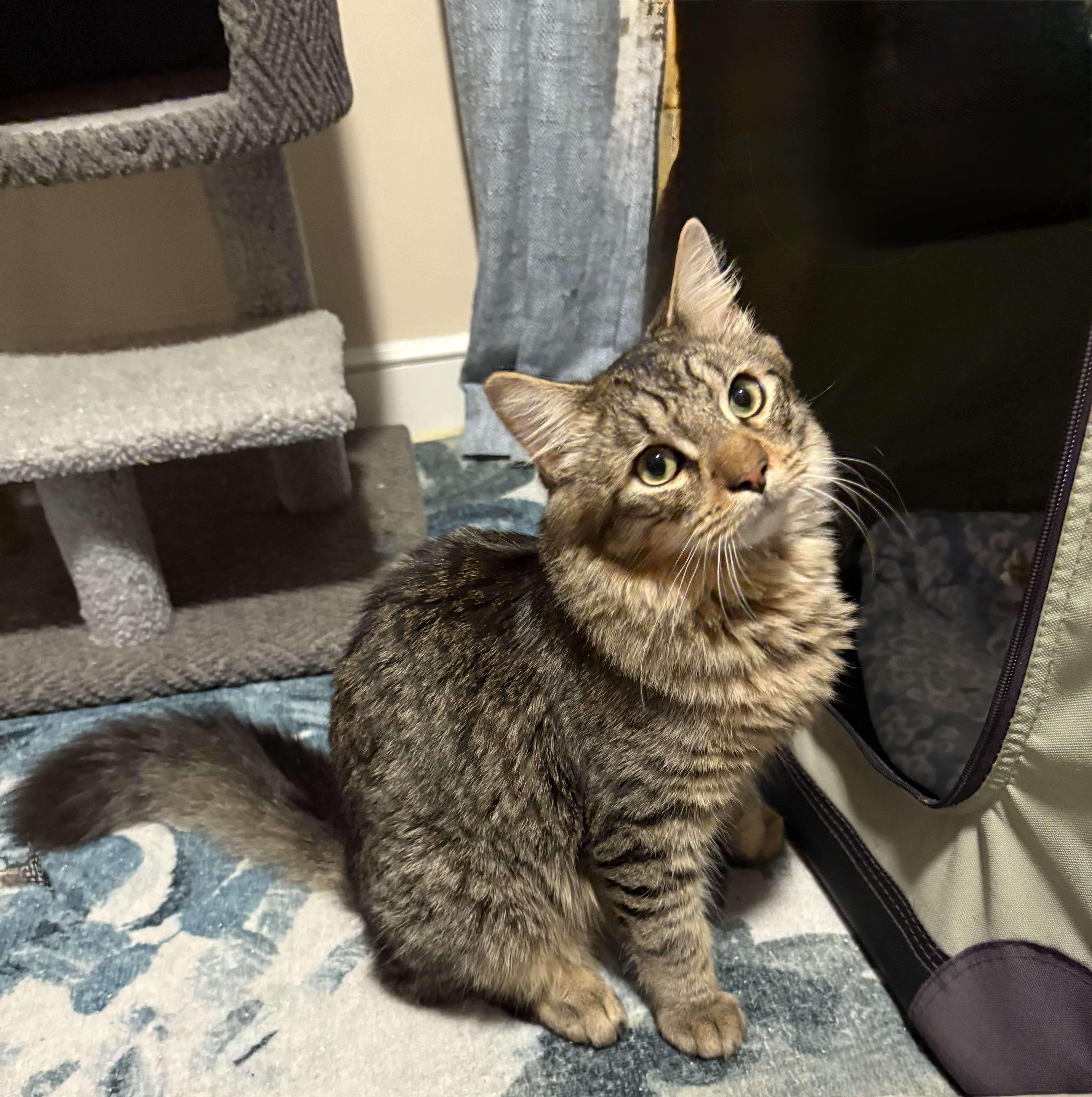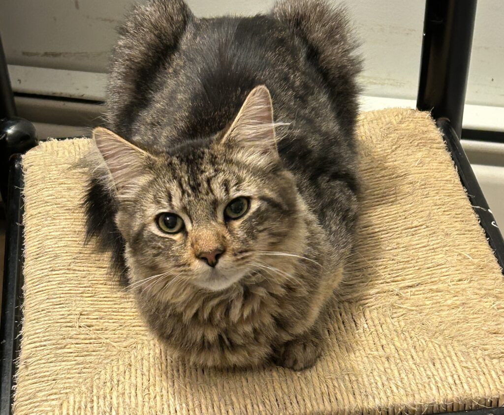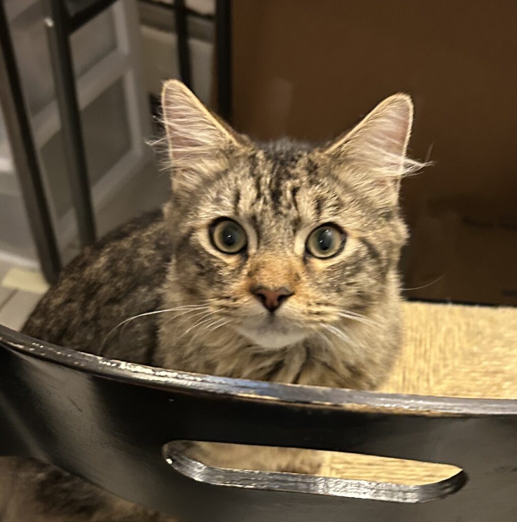 Introducing Xaviar, an 8 month old kitten! He’s the bounciest, sweetest striped boy with the fluffiest tail you’ve ever seen, whose loving eyes will melt you every time. He loves playing with his fishing rod toy and crinkly tunnel and sitting on the top shelf of his cat tree observing the world outside. He loves heights! He is comfortable in a harness on leash and will even let you clip his claws no fuss! He’s curious and affectionate, loves pets and will always want to be in the same room as you, but isn’t quite a lap cat (hey i’m busy being a kitten). He’s high energy and PLAYFUL, looking for a playmate that is looking to wrestle, so would do best in a home with another young less-dominant (but playful) furry friend.