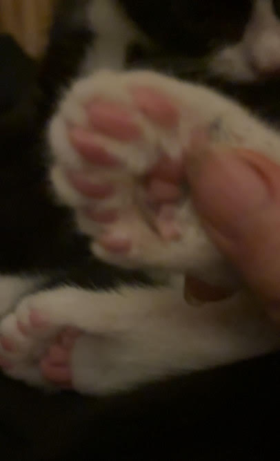 Hi I’m Mixie, an outgoing black tuxedo kitten about 8-9 weeks old. Have you ever met a cat with as many toes as me? 24! That’s 6 extra toes! I was born with bowed front legs. They don’t slow me down at all and make me look really cute when I run. They seem to be straightening out as I grow.