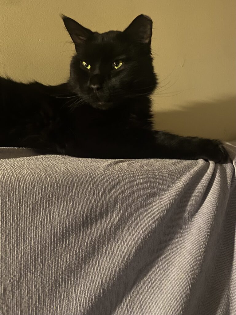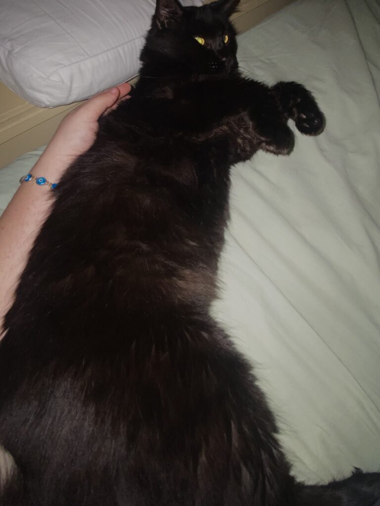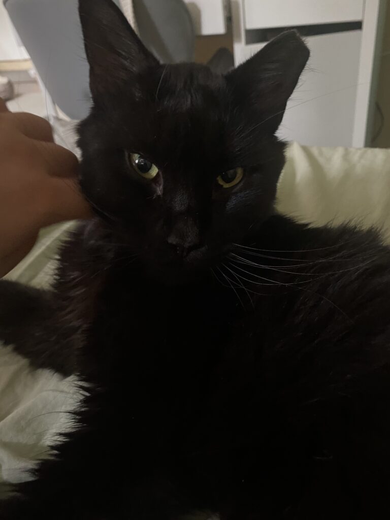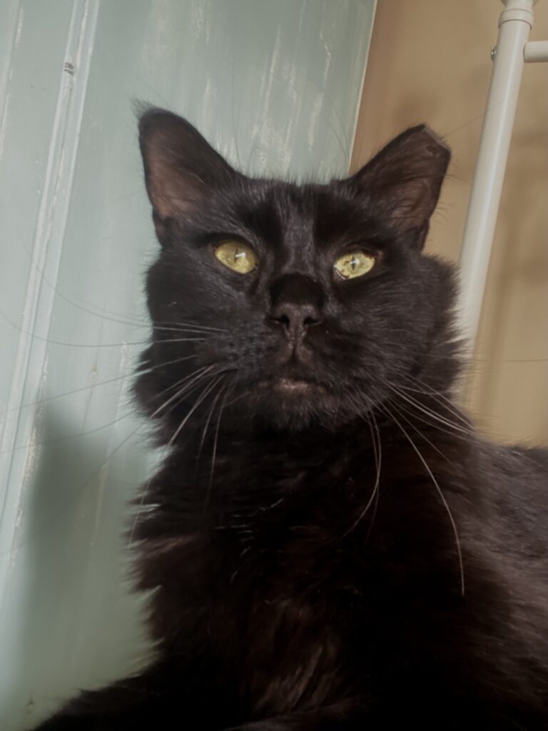 Hi, I’m Hallow, a 5- to 7-year-old gentleman with a long, silky black coat and a tail tip that looks like it’s been dipped in white paint. It only took me three hours to come out of my shell and start showing just how much love I have to give. I’m the kind of cat you can’t ignore: I’ll follow you from room to room, curl up beside you the moment you sit down, and greet you with head bumps and happy purrs until you notice me. I knead biscuits with my paws and melt into every belly rub, and I’ll happily spend the whole day snuggled against you. If you’re looking for a companion who will fill your home (and your lap) with endless affection, I’m ready to be yours!