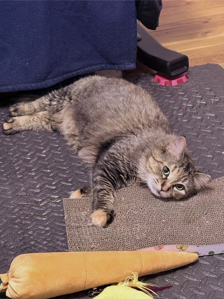Aside from napping, my favorite pastimes are chasing my feather toy, zooming in and out of my tunnel and wrestling with my carrot plushie. Oh, and I love treats! Toss them around and I will go hunt them down!