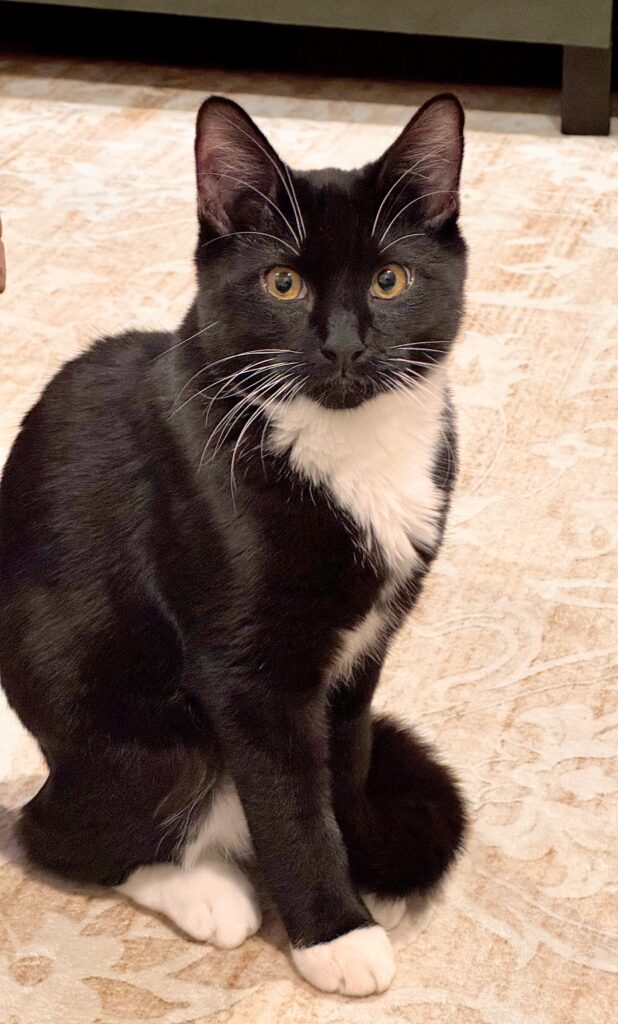 Amber-eyed tuxedo boy Sabino is a friendly, playful little guy with a big personality who needs a home. Sabino was heartlessly left behind by someone who moved away and left him out on the street to fend for himself. A kind person saw him, frightened and hungry, and got him off the street, but couldn’t keep him. Fast-forward to today: Sabino has adjusted well to his foster home. He’s affectionate, curious, and playful with a personality that fills the room. You might find Sabino one minute equally happy curled up in a cozy nook or the next minute batting at a toy with his white-tipped paws. Sabino peacefully coexists with the dog in his foster home. We haven’t seen him around children yet, but we believe he’d likely do well with respectful kids who know how to interact gently with cats. Sabino would do best in an interactive home where he isn’t left alone for long hours. Sabino is about a year old. He seems to be an easy boy who would be suitable for a first-time adopter looking for a devoted companion for life.