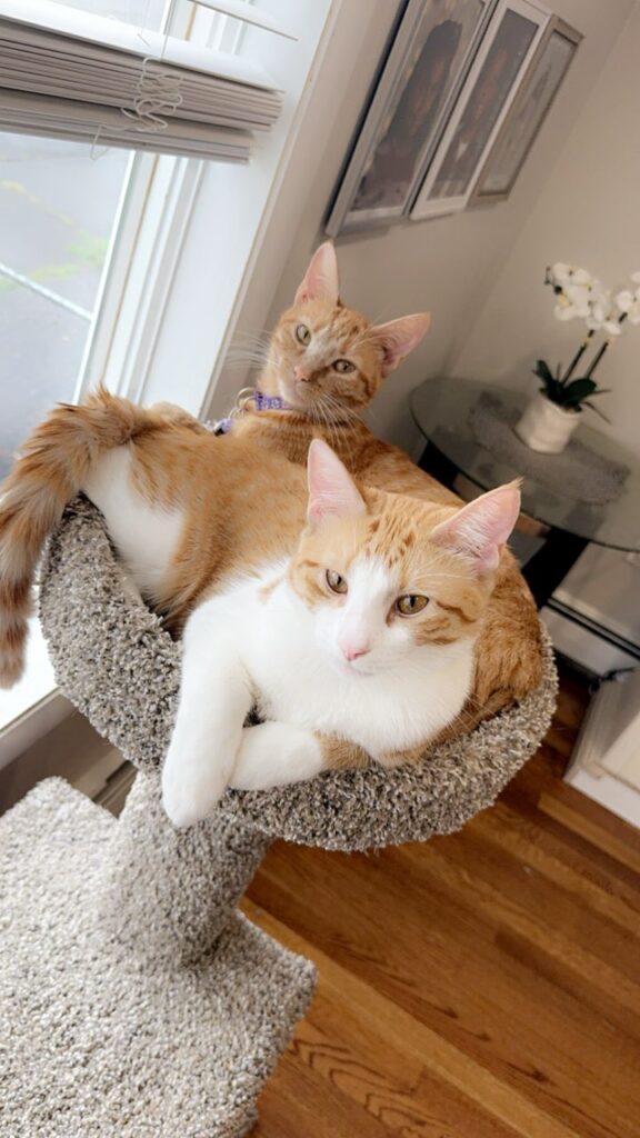 We are Ginger & Leo and are mother & son. Ginger is 2 1/2 years old and I am all Orange Tabby which is unusual for a female and my son Leo is 1 1/2 years old and he is Orange Tabby with White. We are so sad, because our humans had a baby and they recently found out that the young human is allergic to our fur. Our humans are sad, but they need to do the right thing for their young baby. We do really well with young children and small dogs. Me, Ginger, “Mom to Leo” I am very affectionate, but I am fine to just lay around the house and chill. My son Leo is shy at first, but once he sees the affection I get he quickly settles in and loves to cuddle. We would love to stay together as we have never been apart. Will you please consider adopting both of us and giving us a chance to live a fun filled life together with you!