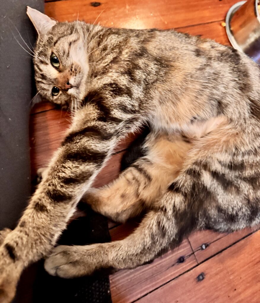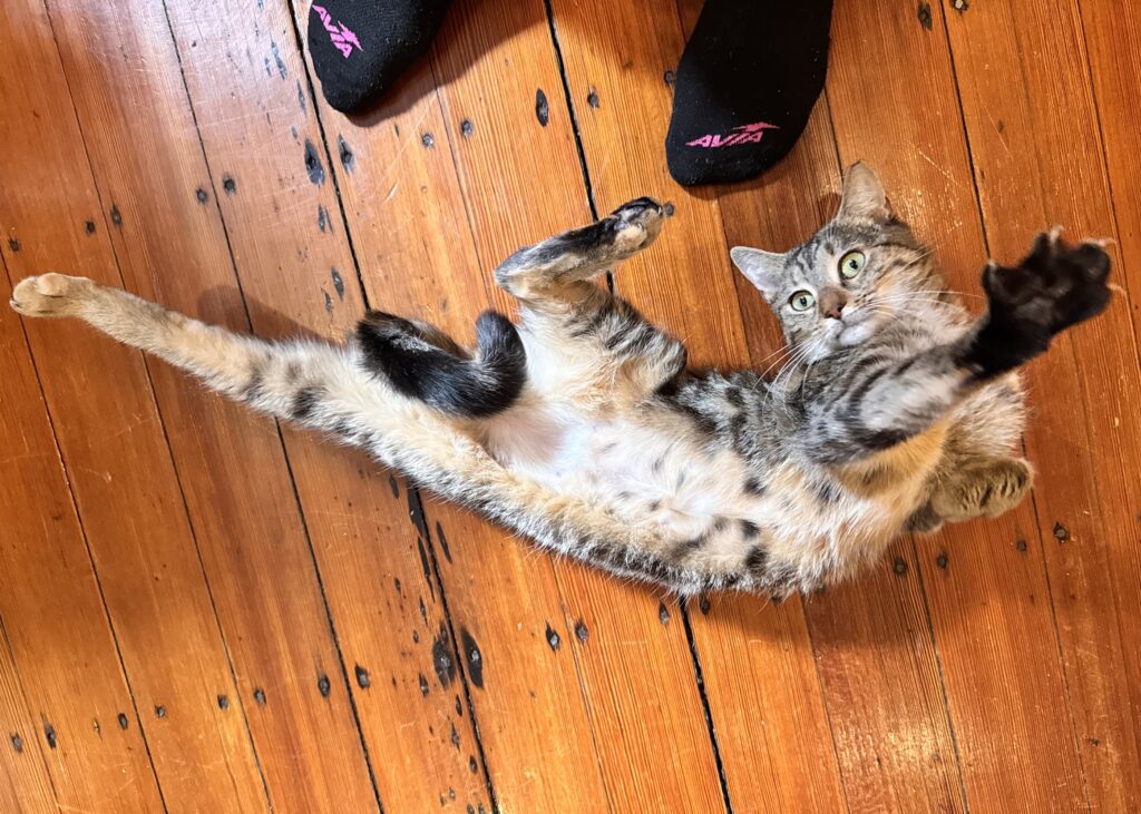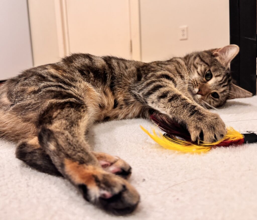 My name is Mocha and I’m a 1 year old female torbie. I was rescued from outside, and now that I’m safe indoors, I’m learning just how wonderful this life can be. My foster mom says I have a beautiful, unique coat that I love to stretch out and show off. I’ll happily roll over for belly rubs, make lots of biscuits, and purr the whole time.