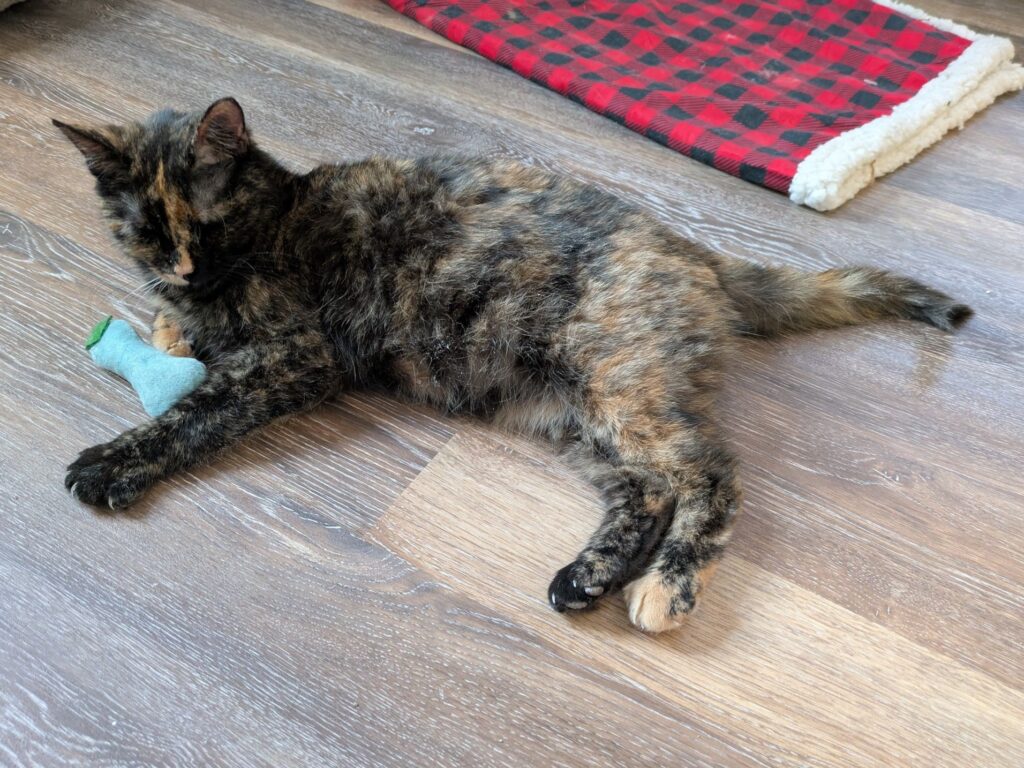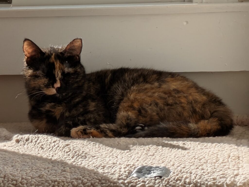 Hi, my name is Violet, and I’m a two-year-old female tortoiseshell cat looking for a quiet, patient family to call my own. As a “spirit cat,” I tend to stay in the background, and you’ll probably spot me peeking out from my favorite cozy hiding spots rather than actively engaging with you. Once I feel safe, I love to be petted, and I’ll roll around and ask you to scratch behind my ears and rub my tummy. I thrive in peaceful environments, especially alongside other cats who understand my need for a tranquil home. I love hanging out with my quiet, older foster cat siblings; their calm presence gives me comfort and confidence.