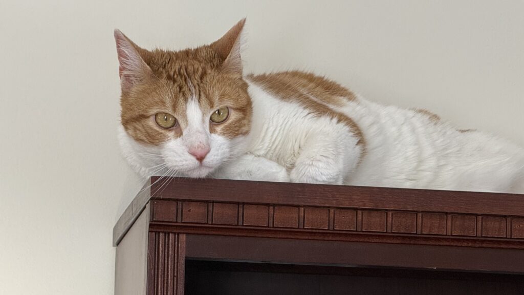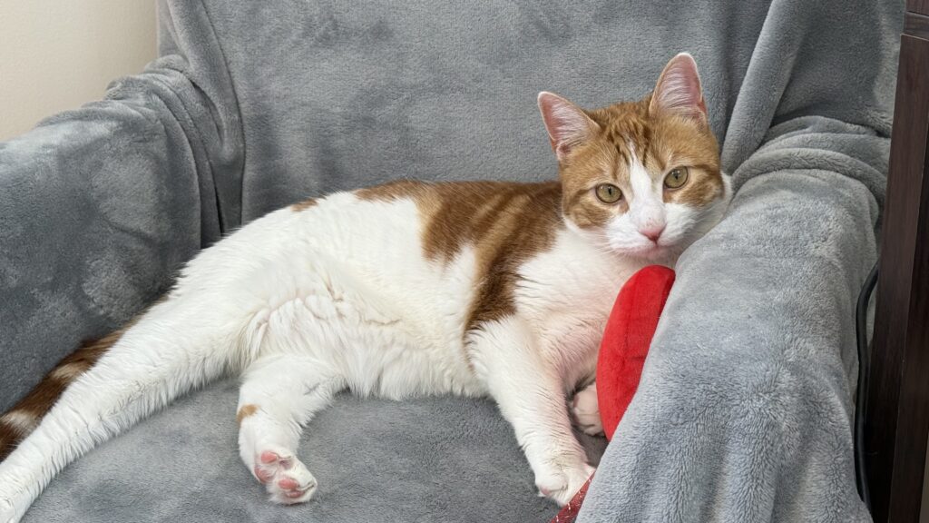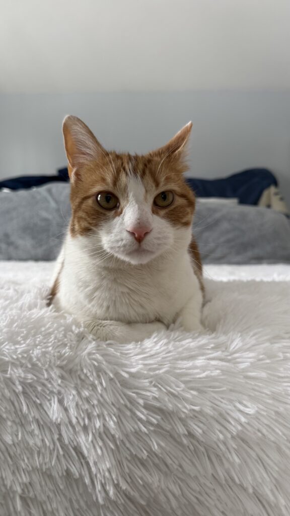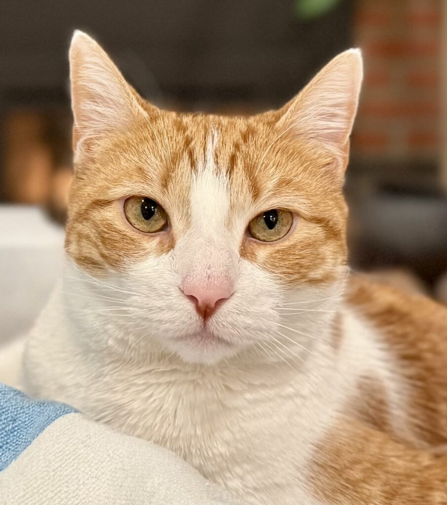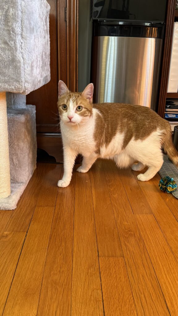 Hello! I’m Goldie, a 2½‑year‑old orange tabby with snowy white patches. I’ve had a tough start in life, so I take a little Prozac to help my me feel steady and secure. Don’t worry — I’m very good about taking it when you mix it into my wet food. I eat every bite.