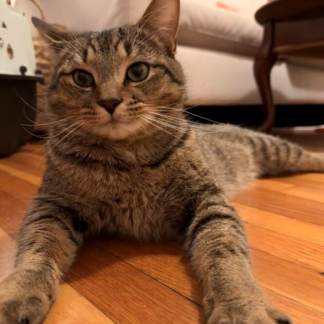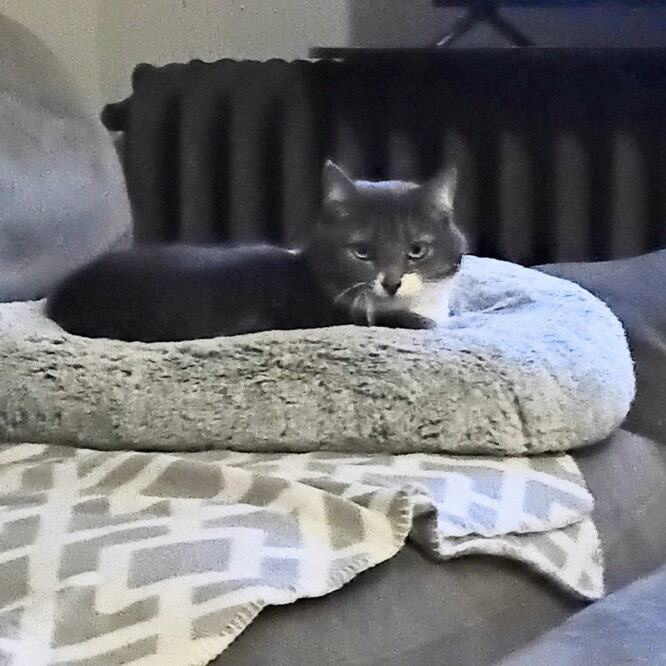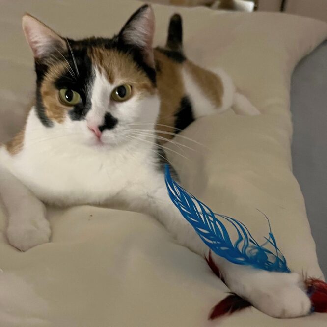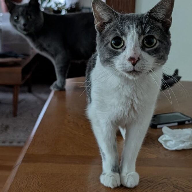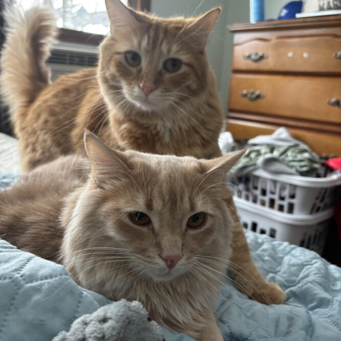 I’m Peanut and this is my sister, Butter. We are 1.5 years old and bonded–so we definitely need to be adopted together! Our owners decided one day they didn’t want us any more. We aren’t sure why because we are friendly lovebugs. I love to be held and carried around. Butter takes a bit longer to get comfortable, but she is a good sister and a special kitty. We would prefer a